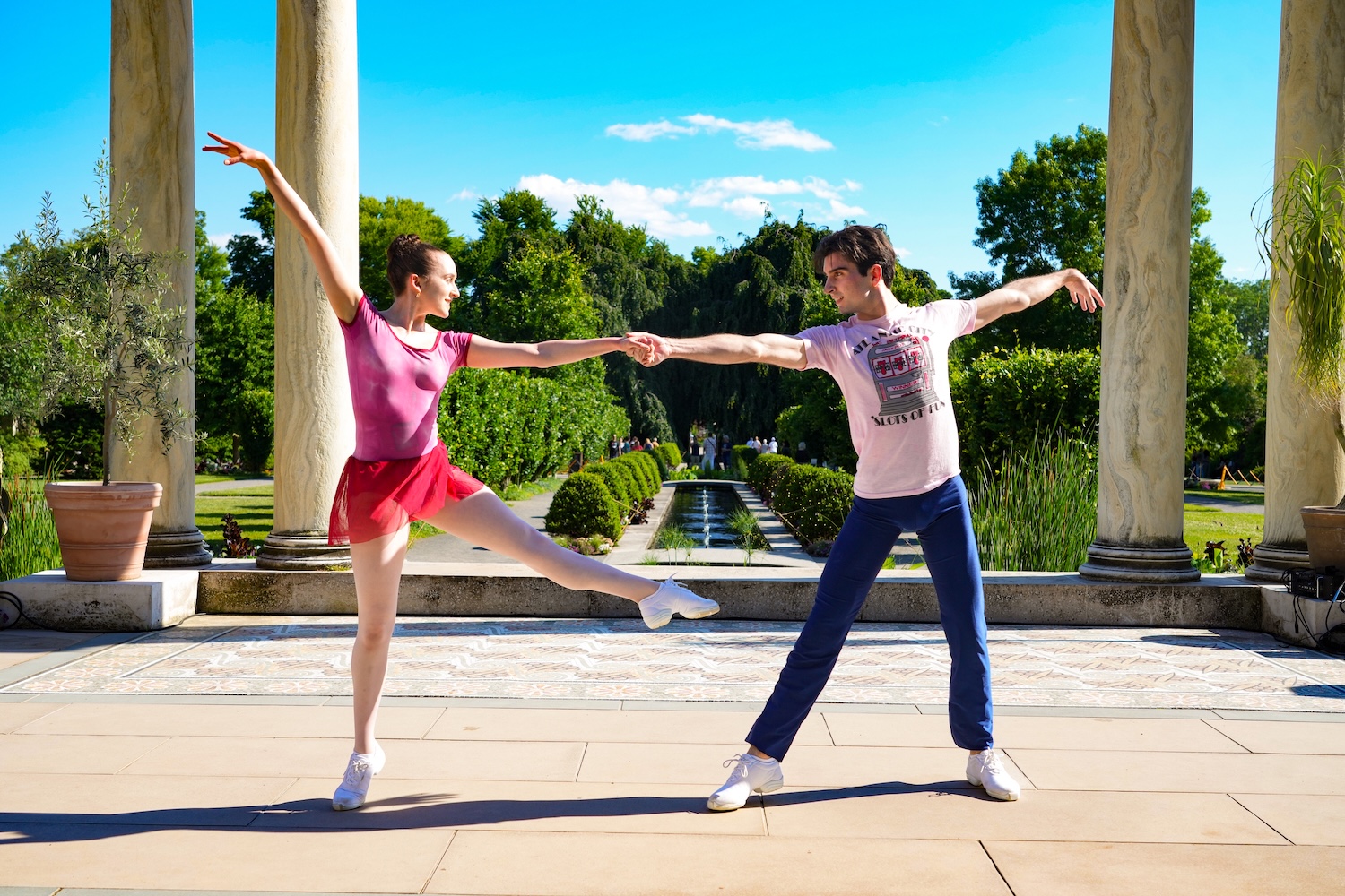 Gabriella Domini (left) and Noah McAuslin in Tom Gold’s Counterpoint at Untermyer Park and Gardens. Photo: Steven Pisano
